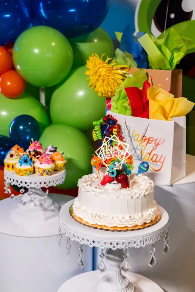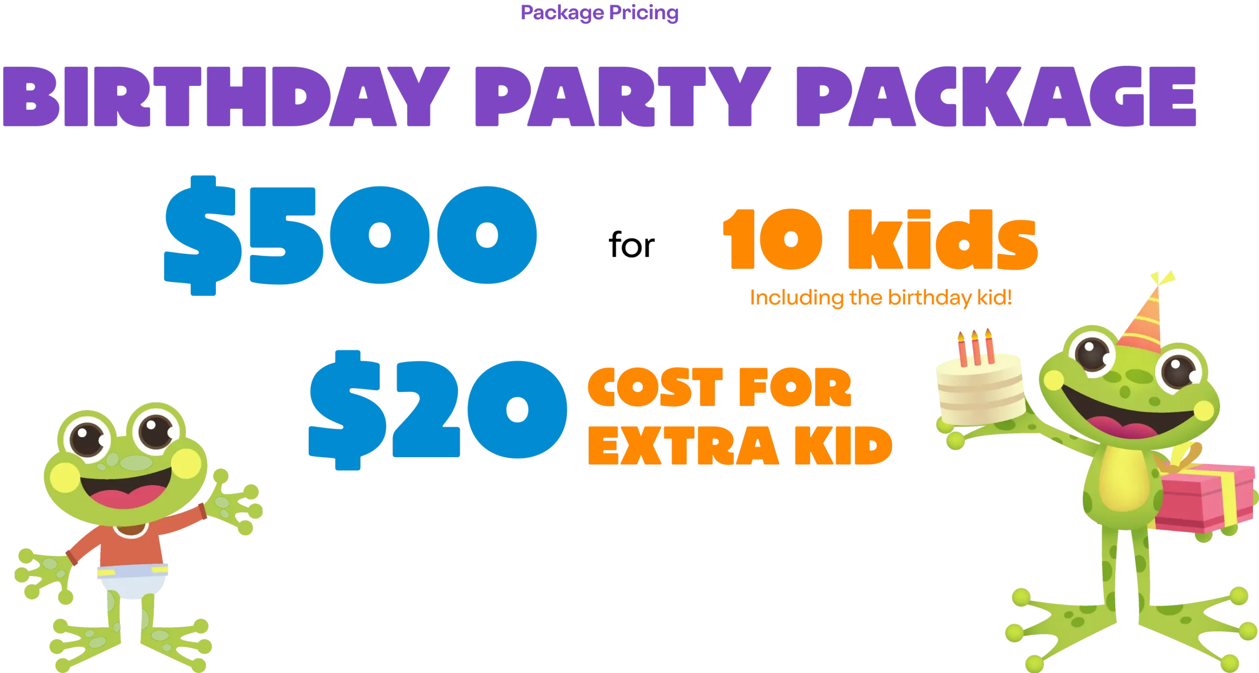 Our birthday party packages typically include an all-day playtime pass, one-hour private decorated party room rental, a party host to assist with set-up and clean-up, a choice of vanilla or chocolate cake, one party favor per child, one small bottle of water per child, and decorated balloons. We also offer different add-ons. Please contact us or visit our birthdays page for a complete breakdown of our party packages and their offerings.